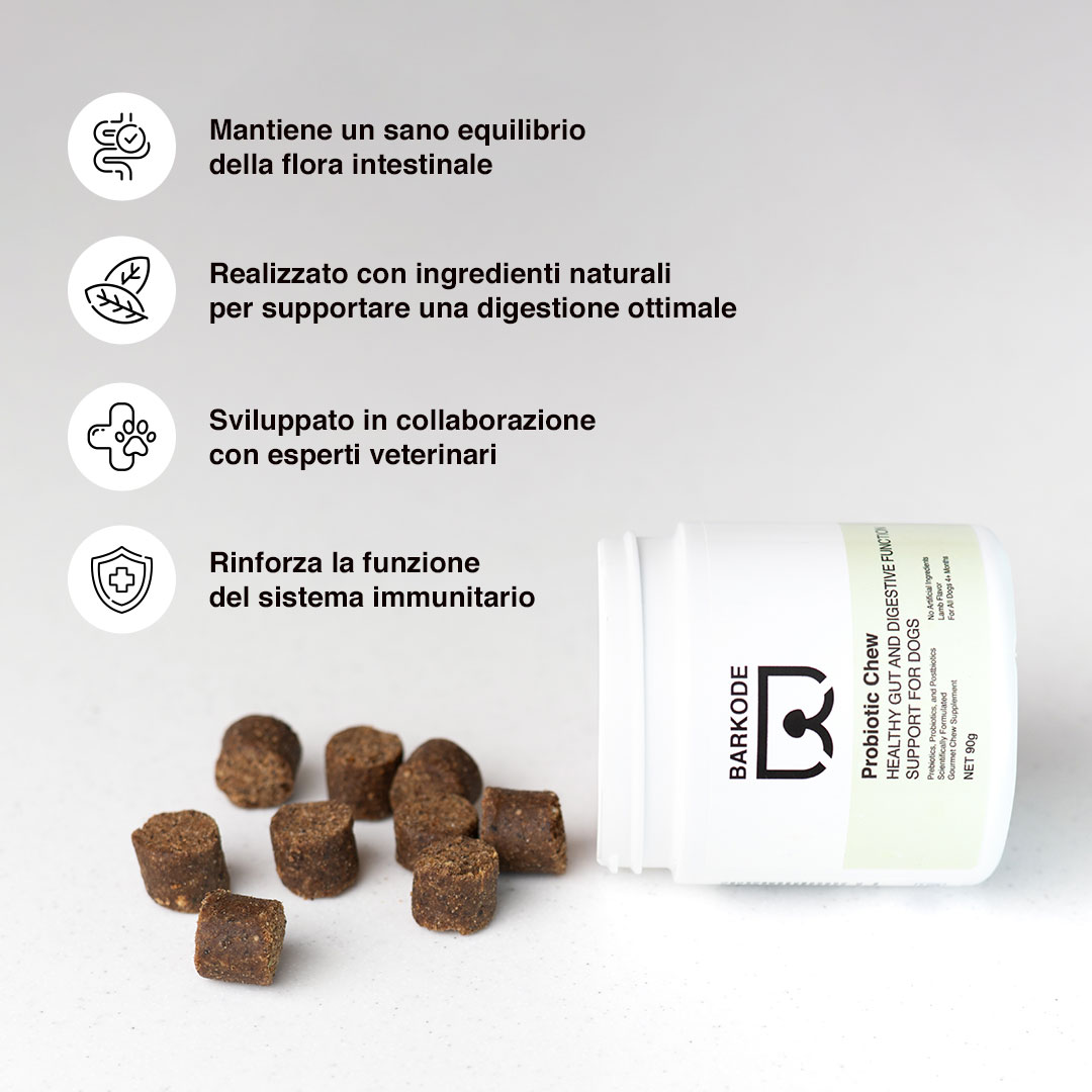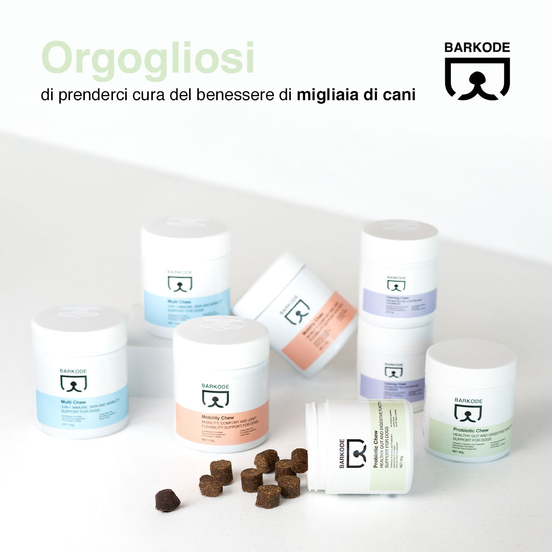 Il mio cane ha lo stomaco sensibile e frequenti problemi digestivi. Da quando gli do i probiotici BARKODE, è molto più stabile ed energico. Anche il suo pelo è migliorato!